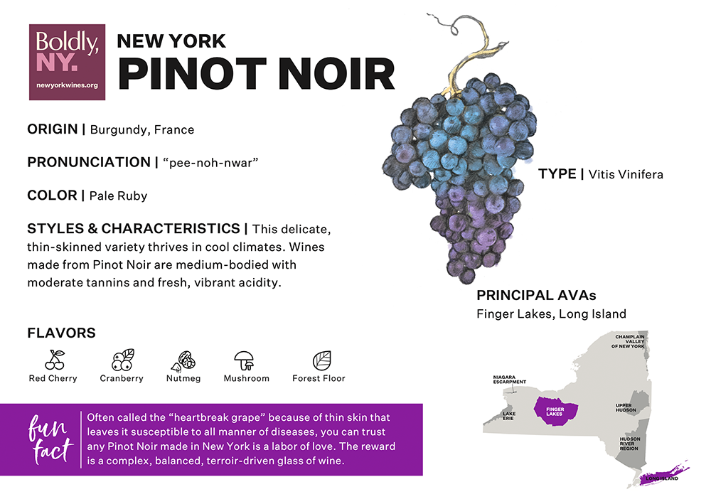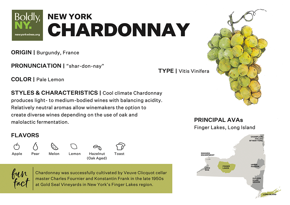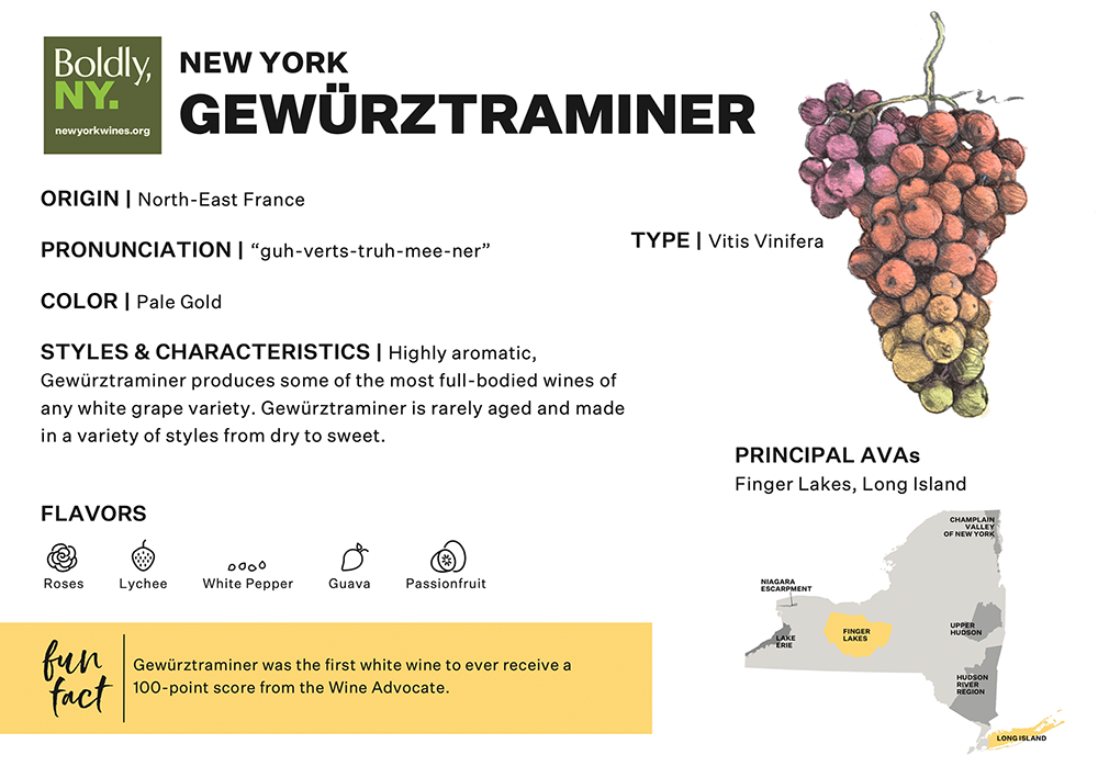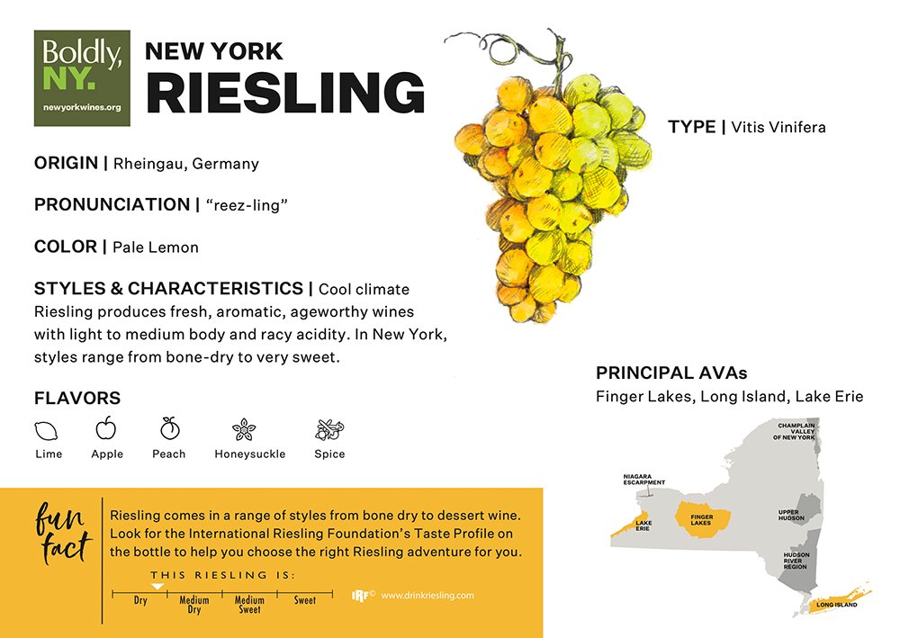 味わいと香り: 冷涼な気候のリースリングは、ライトボディからミディアムボディで活き活きとした酸味を持つ、フレッシュで香り豊かな熟成能力のあるワインを生み出します。リースリングは、典型的なリンゴ、有核果実、花、蜂蜜、スパイスの特徴を持つ複雑な香りがあります。ニューヨークのリースリングは、極辛口から極甘口まで、さまざまな範囲の残糖度で造られています。ブドウが「貴腐菌」(ボトリティス・シネレア)の影響を受けた場合や、収穫後期にブドウ樹の上でブドウの水分が蒸発した場合、優れたデザートワインに仕上がります。