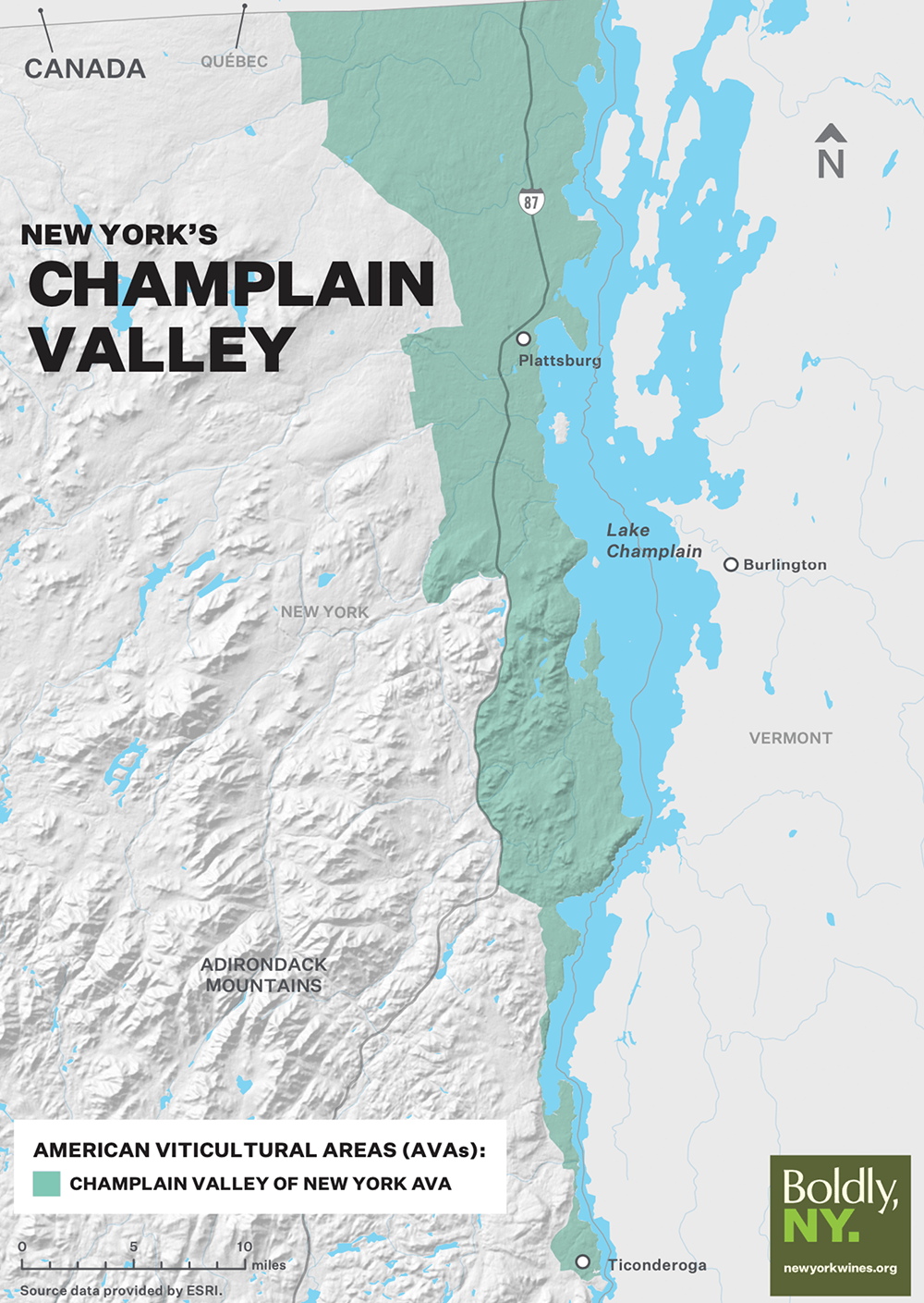 ニューヨーク州とバーモント州の境界に位置する、美しく歴史的なシャンプレイン湖。寒冷な気候に適したリンゴやフルーツの名産地としてもよく知られている。この地域では、冷害に強いミネソタ種のブドウ栽培が重要視されており、アルバニーの町とカナダを結ぶノースウェイ(州間高速道路87号線)に沿ってワイナリーが設立されている。